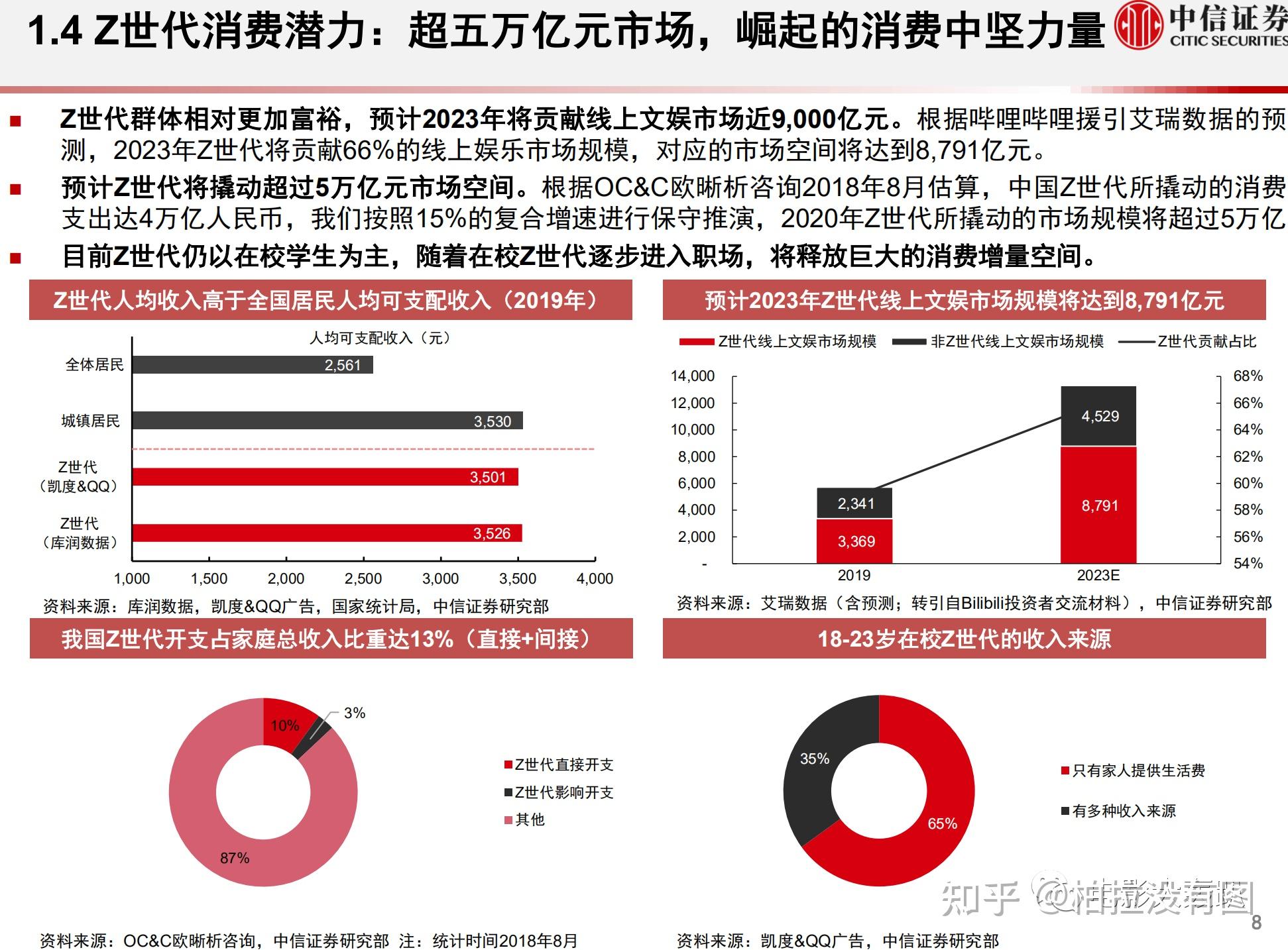 Z世代群体相对更加富裕,预计2023年将贡献线上文娱市场近9,000亿元。根据哔哩哔哩援引艾瑞数据的预测,2023年Z世代将贡献66%的线上娱乐市场规模,对应的市场空间将达到8,791亿元。 ? 预计Z世代将撬动超过5万亿元市场空间。根据OC&C欧晰析咨询2018年8月估算,中国Z世代所撬动的消费支出达4万亿人民币,我们按照15%的复合增速进行保守推演,2020年Z世代所撬动的市场规模将超过5万亿。大众娱乐 皇冠国际娱乐? 目前Z世代仍以在校学生为主,随着在校Z世代逐步进入职场,将释放巨大的消费增量空间。