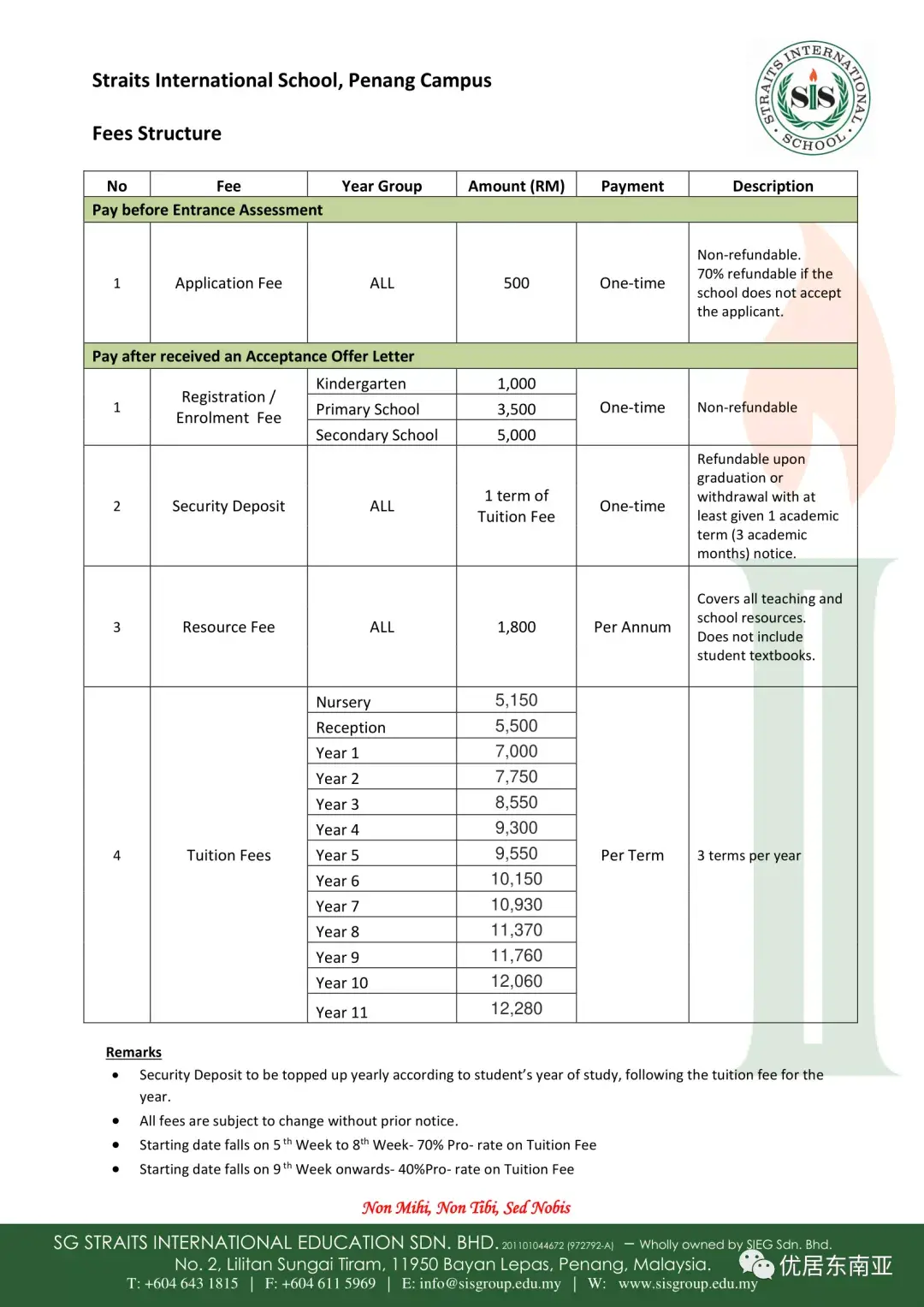 入学程序:年满四周岁以上的外籍学生皆可申请入学,填写申请表格(RM1,000申请费),安排时间进行分班考试,收到录取信后即可入读学校。