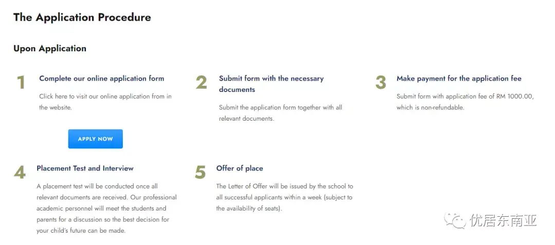 提交申请表至学校,随函附500马币的申请费。按照指示完成后续表格并寄到学校(5张蓝底近照、影印件:学生护照、出生证、最新成绩册、健康报告、父母的护照)。通过CAT4测试进行评估,十天内可收到录取通知书,随后缴付注册费、一学期学费及保证金。
