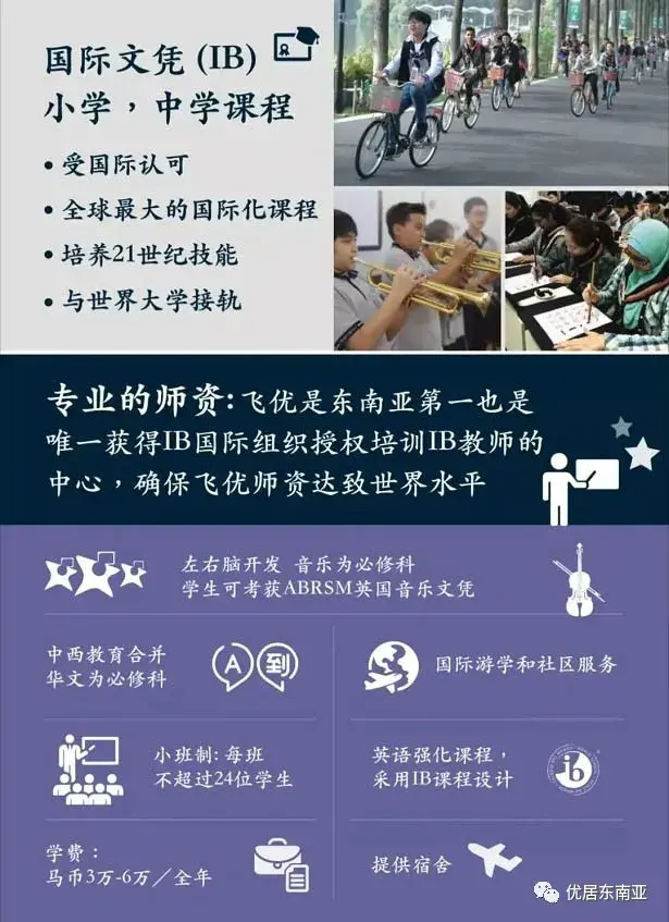 飞优国际学校自1978年创校以来一直致力于提供优质的国际教育服务。飞优采用全球认可的国际文凭(International Baccalaureate,IB)课程,是马来西亚最大的国际文凭旗舰学校,在马来西亚有5个校区(吉隆坡、梳邦、槟城、新山、怡保),还有飞优IB教育学院和飞优波德申教育实践基地,同时还有一所海外校区坐落于英国苏格兰。